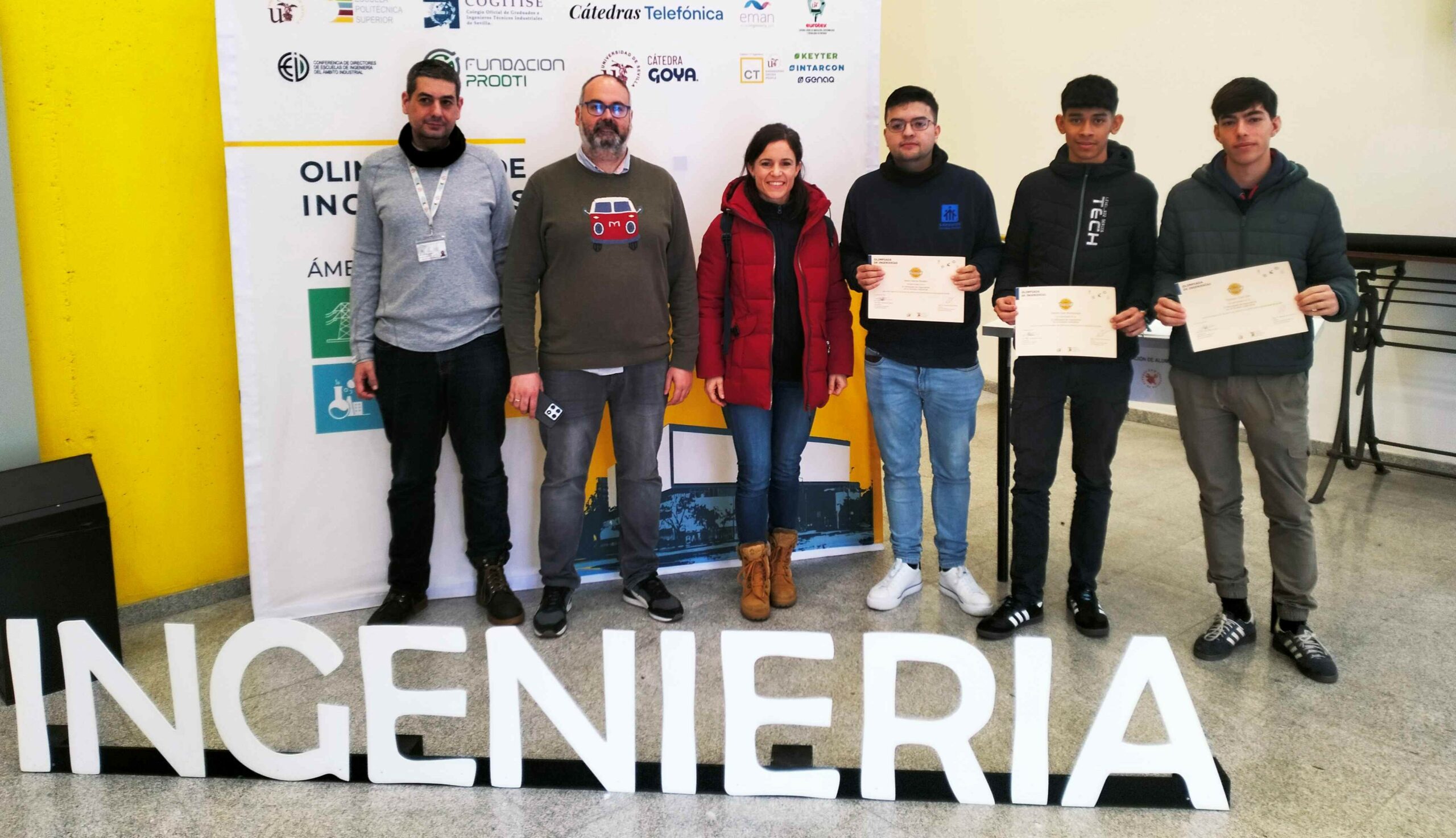 D. Diego Francisco Larios Marín y D. Enrique Personal Vázquez, Profesores Titulares del Dpto. de Tecnología Eléctrica de la Universidad de Sevilla en la Escuela Politécnica Superior (antiguos alumnos de FP de nuestro colegio) con nuestros alumnos participantes así como la docente que los acompañó en el proceso.